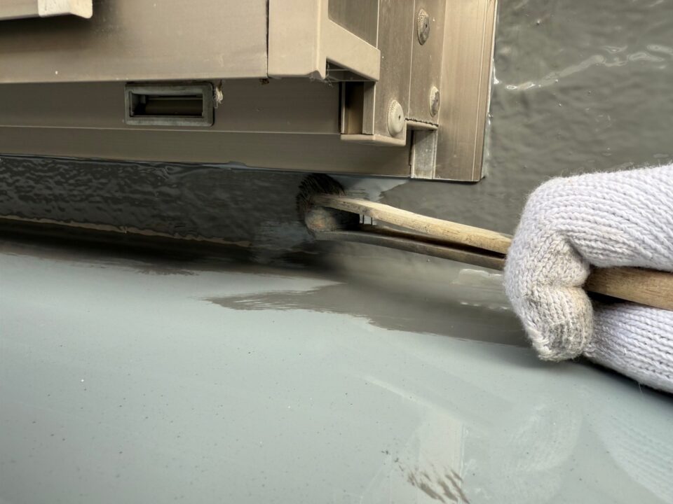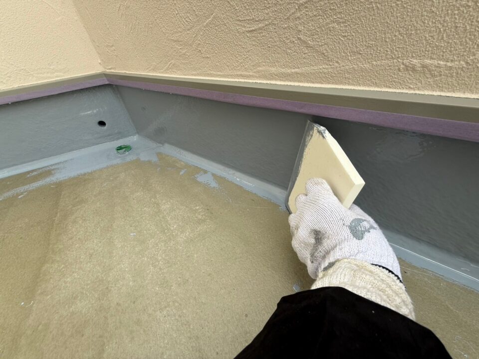 平面に厚みが均一になるようにウレタン塗膜防水材1回目を鏝塗りします。