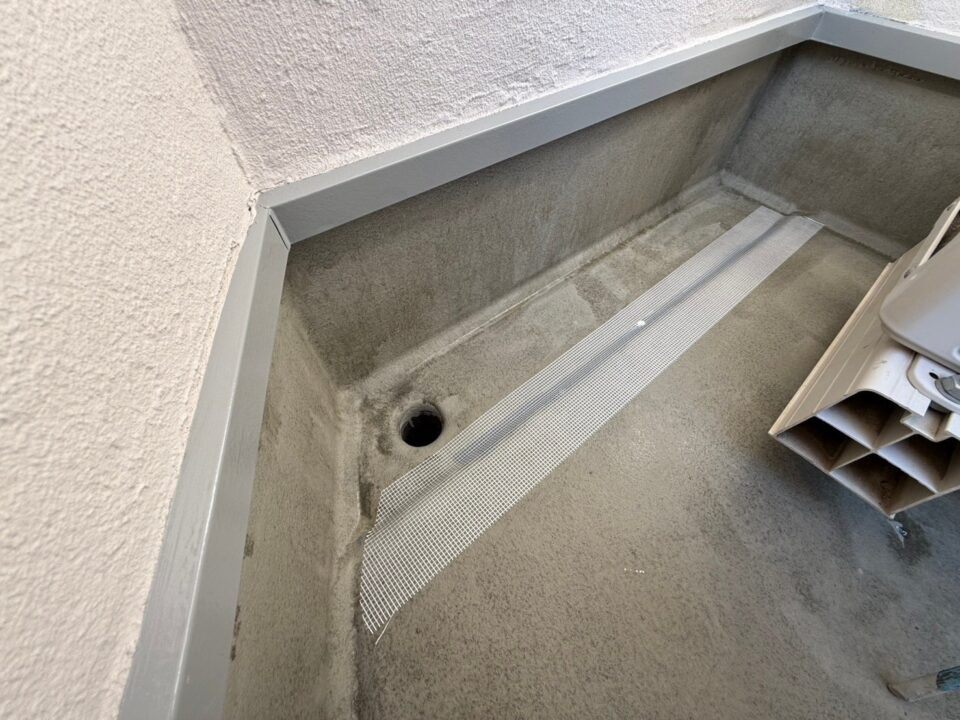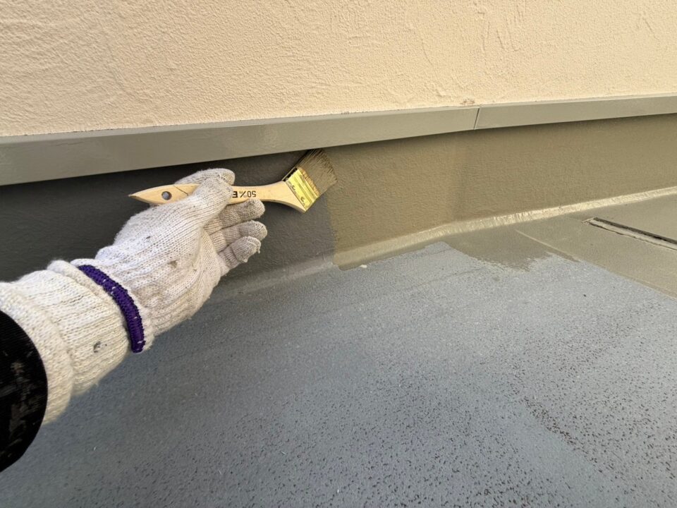 立面と補強布部に1回目のウレタン塗膜防水材を塗布していきます。