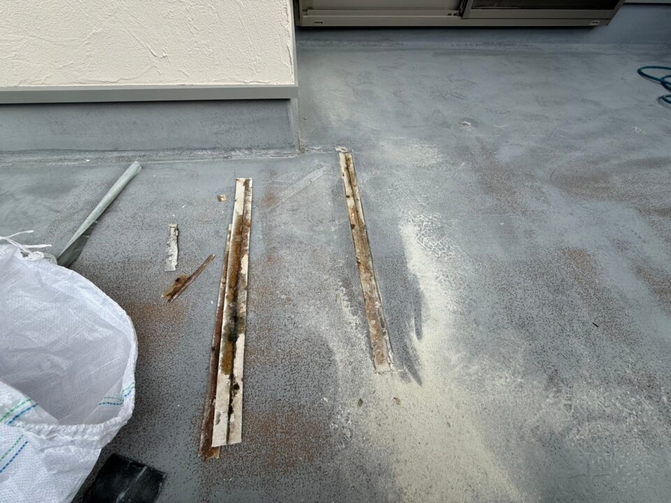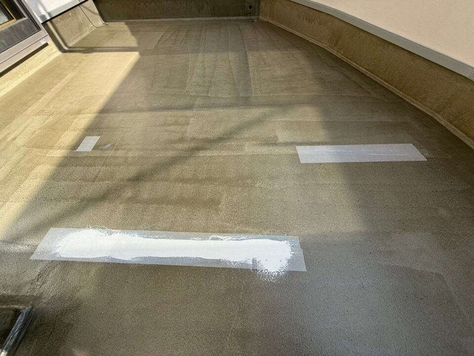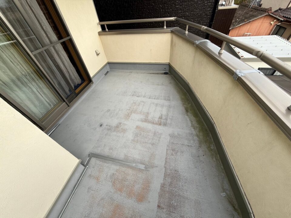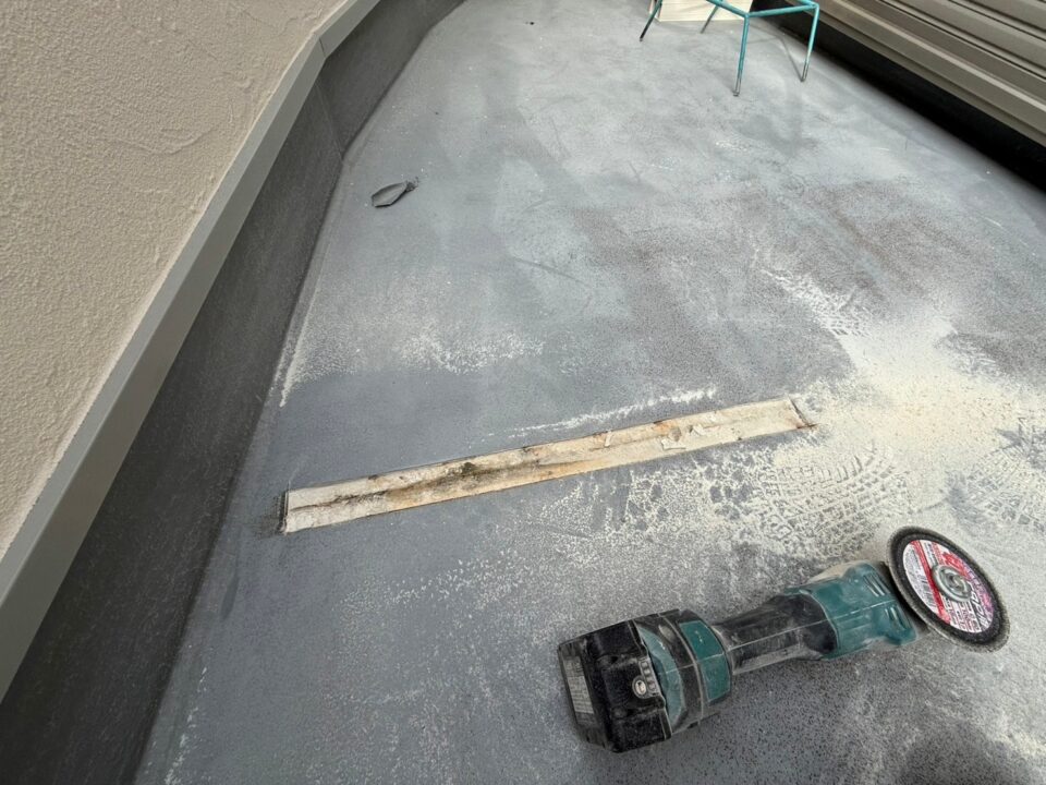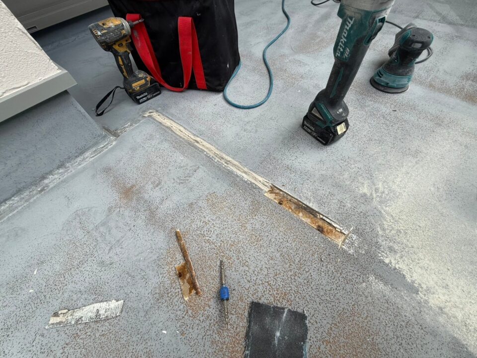 雨漏り修繕のご依頼をいただきました。既存FRP防水の経年劣化で防水層の破断が原因となります。ウレタン塗膜防水材密着工法(高強度仕様)で施工しました。